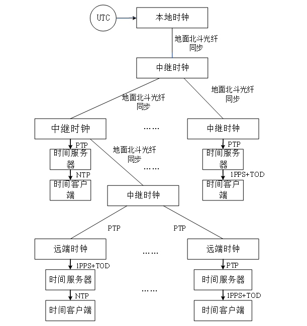 常用的网络授时技术有NTP、PTP、1PPS+TOD以及新葡萄88805官网专利技术-地面北斗授时等。其中NTP主要用于公网或局域网毫秒级精度授时,PTP主要用于专用网络内部纳秒级精度授时,1PPS+TOD主要用于专用机房内短距离(100米内)纳秒级精度授时,泰富专利技术-地面北斗授时则主要用于专用网络中远距离皮秒级精度授时。一个完整的授时网通常是由上述几种授时技术组合而成的多节点、长距离授时系统,如下图所示: